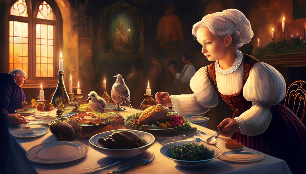 O banquete preparado por Babette é uma obra-prima da alta gastronomia francesa, composta por pratos requintados que contrastam com a simplicidade da vida na aldeia. Entre os pratos servidos estão a sopa de tartaruga, um prato exótico e luxuoso; blinis Demidoff, panquecas delicadas servidas com caviar e creme azedo; codornizes em sarcófago, uma preparação elaborada em que as aves são recheadas e envoltas em massa folhada; e uma sobremesa de baba ao rum com frutas cristalizadas. Cada prato é acompanhado por vinhos franceses de alta qualidade, como o raro Clos de Vougeot e o champanhe Veuve Clicquot. Estes pratos, além de representarem a sofisticação da culinária francesa, simbolizam o amor e a dedicação de Babette, que investe todo o seu prémio na criação de uma experiência única para a comunidade.